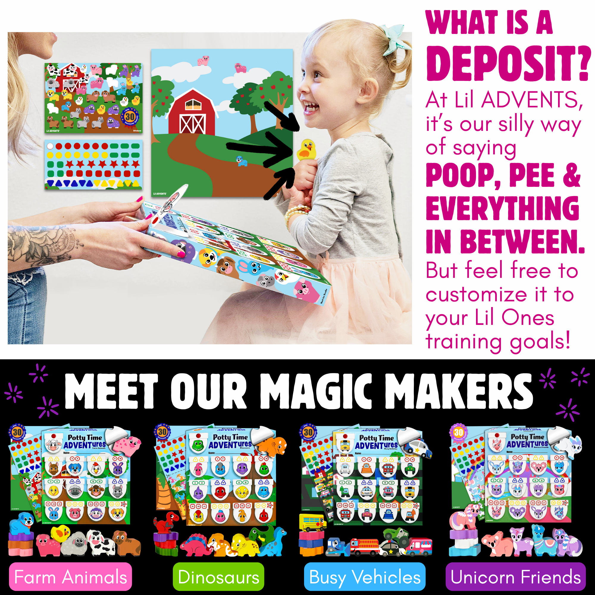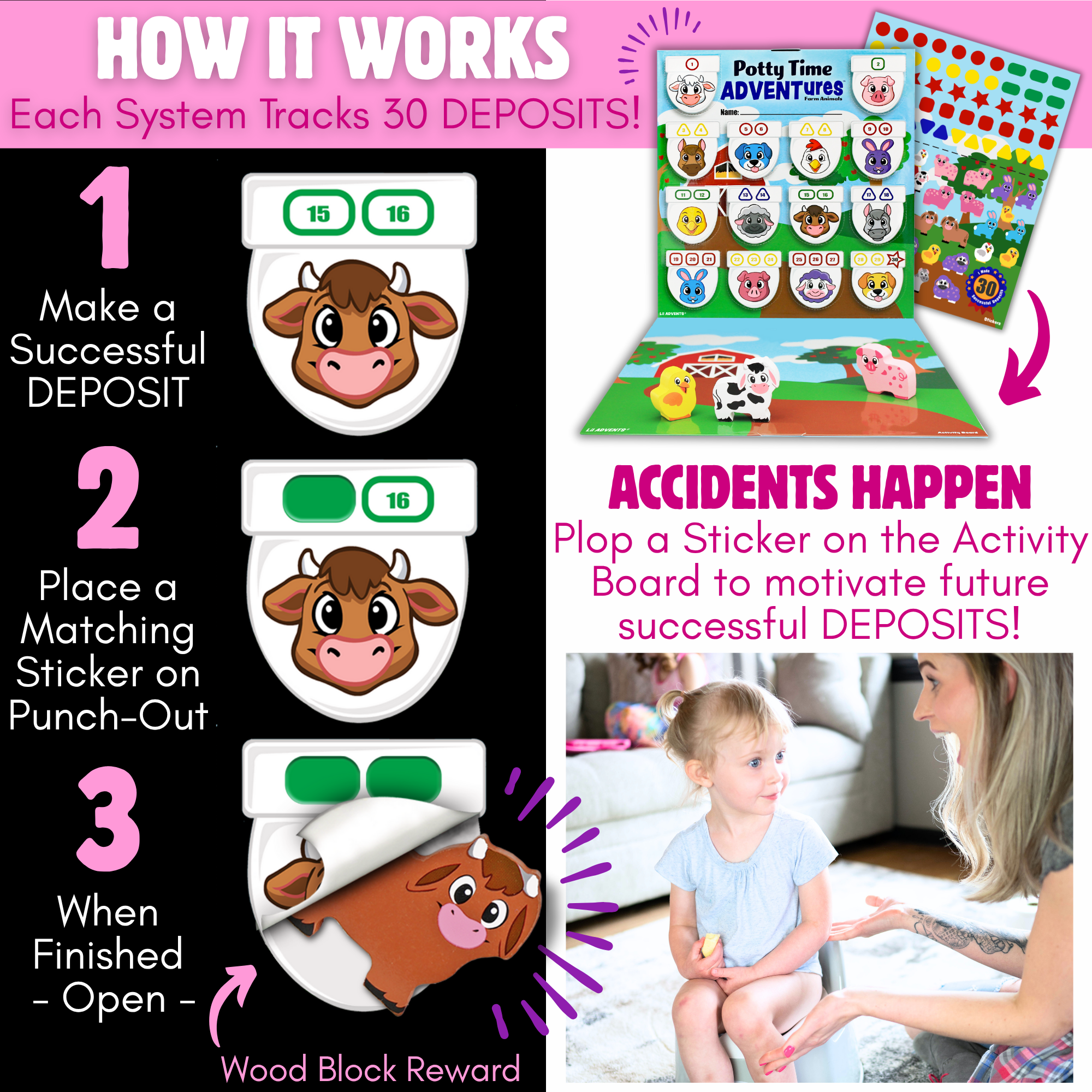 - INCLUDES – Potty Time ADVENTures Potty Training Chart, Activity Board, Farm Stickers & 14 piece Wooden Farm Toy Set. This toddler potty training chart for boys and girls is educational and builds healthy lasting behaviors. Box Size: 12.75"x11.5"x1.5"