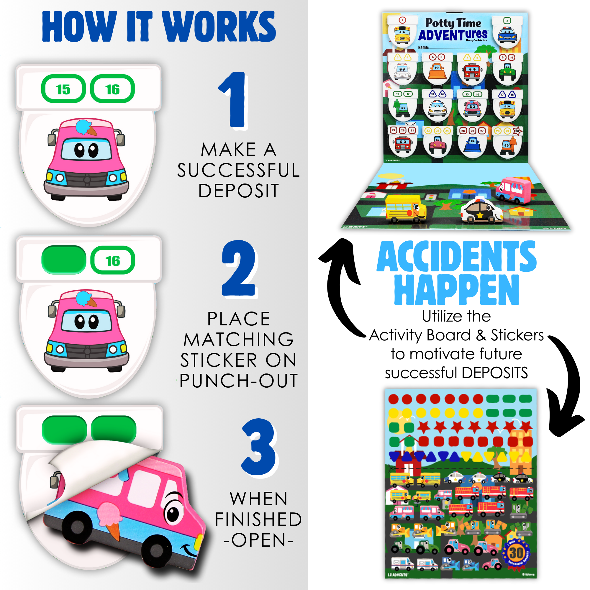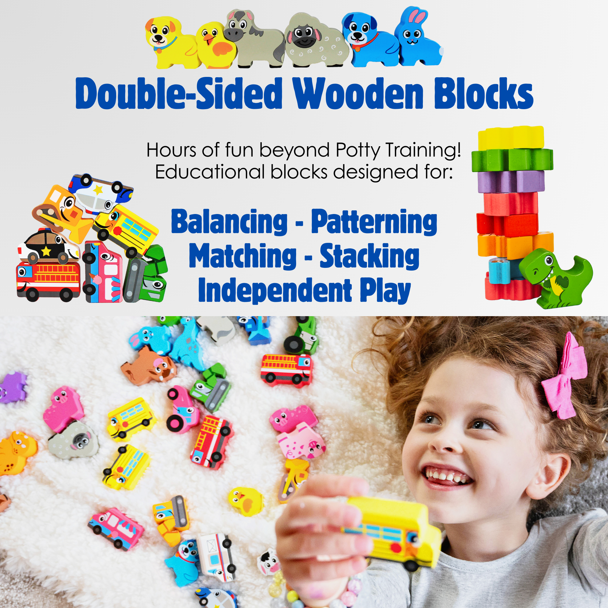 This set includes a PTA Chart, 14 potty punch-outs, 14 busy vehicle-themed wooden blocks, an activity board, and a completion badge. With every successful deposit, your child will stay motivated and excited to complete their potty training journey!