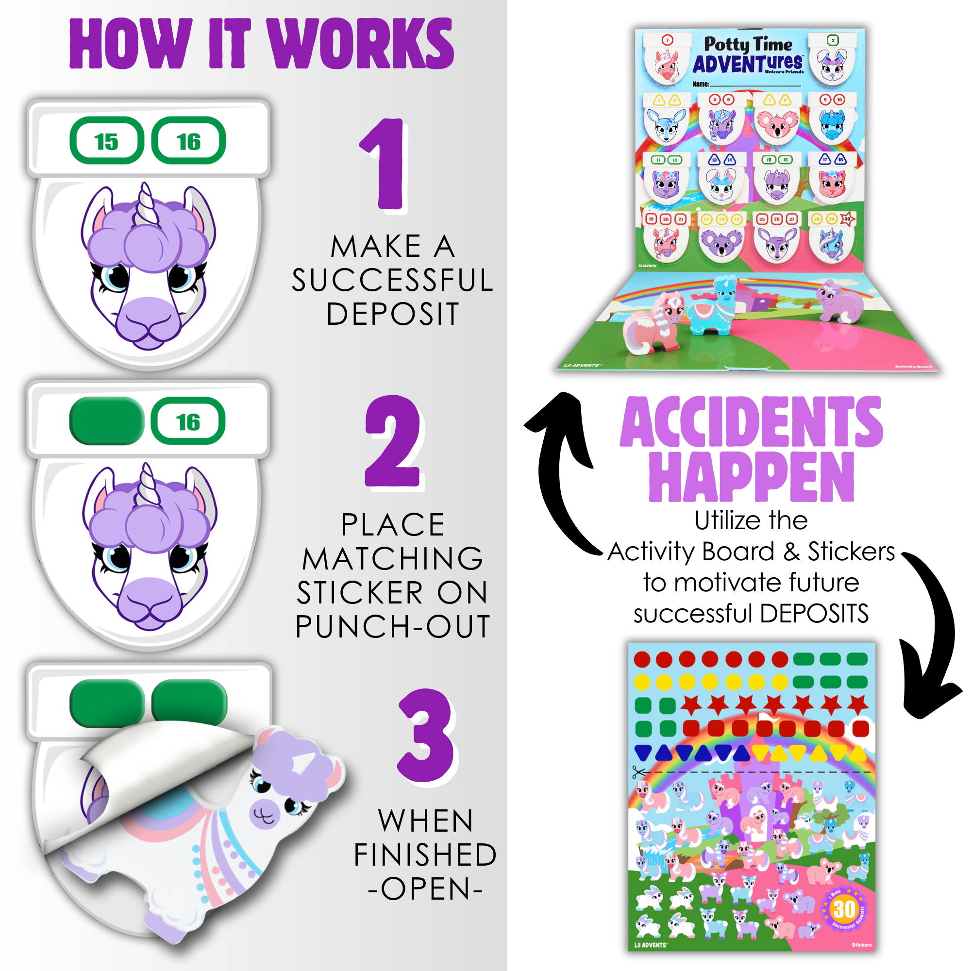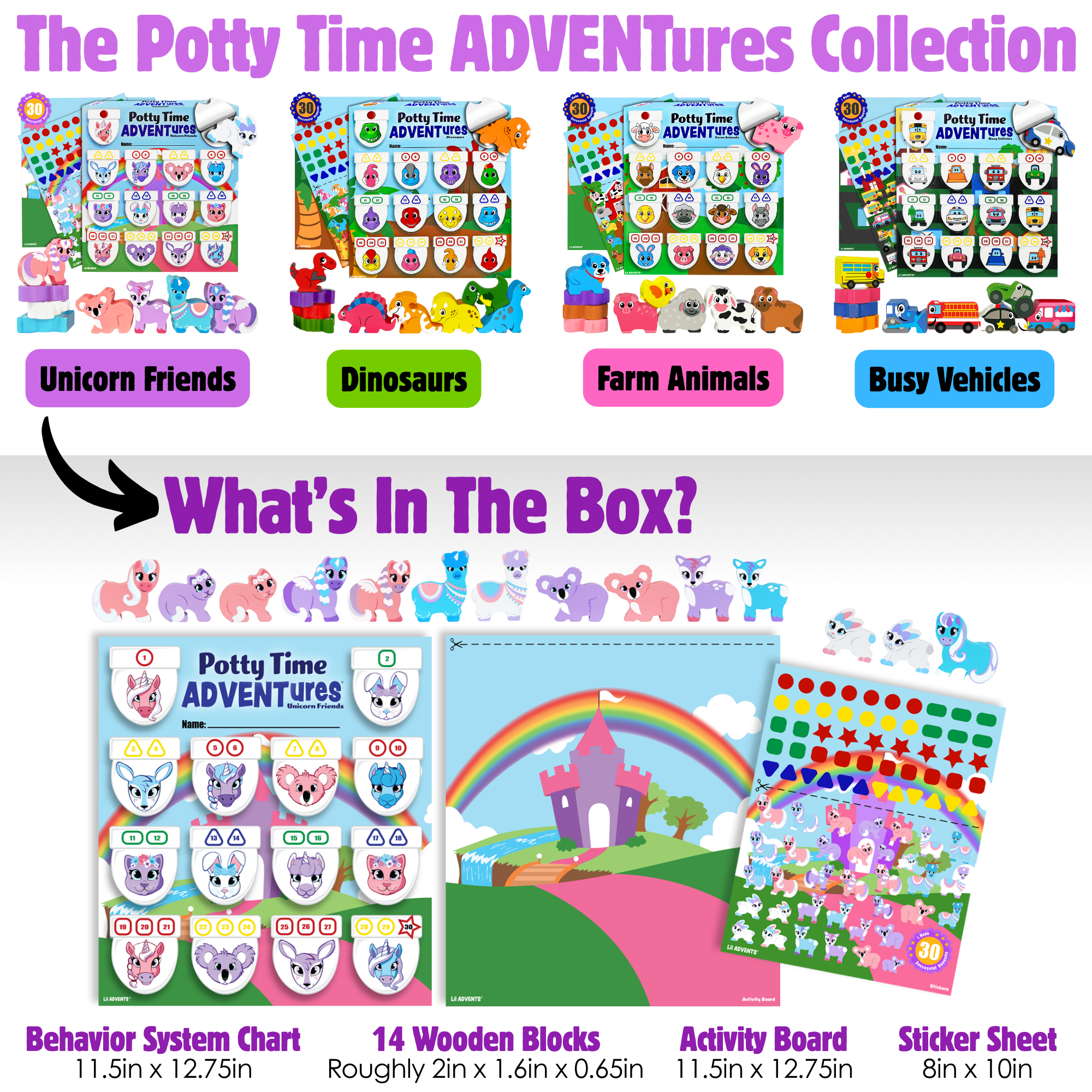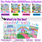 Make potty training a magical experience with Potty Time ADVENTures - Unicorn Friends! Specifically designed for toddlers 18 months and up, this interactive game helps your Lil One tackle this milestone! Using an advent calendar-style chart, your child will be rewarded with stickers and hidden themed wood blocks after every successful Deposit.