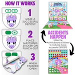 • Complete a potty punch-out with 1–3 successful deposits. Even on tough days, reward your child with a themed sticker for their activity board to keep them motivated.